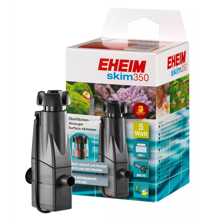 In fast jedem Aquarium bildet sich an der Wasseroberfläche mit der Zeit ein Film aus Mikroorganismen, Staub, Ölen und Futterfetten – die Kahmhaut. Mit dem EHEIM skim350 Oberflächenabsauger beseitigen Sie zuverlässig diese Kahmhaut und erreichen so eine glasklare Wasseroberfläche und einen höheren Sauerstoffgehalt. Der EHEIM skim350, ausgelegt für den Dauerbetrieb ist aber auch für einen kurzfristigen Einsatz geeignet. Bei abwechselndem Einsatz in mehreren Aquarien, bitte darauf achten, dass keine Algensporen oder Krankheiten übertragen werden. Die angesaugten Bakterien und Schmutzpartikel sammeln sich im Filterschwamm. Dieser wird nach dem Einsatz einfach herausgenommen und gründlich gereinigt.