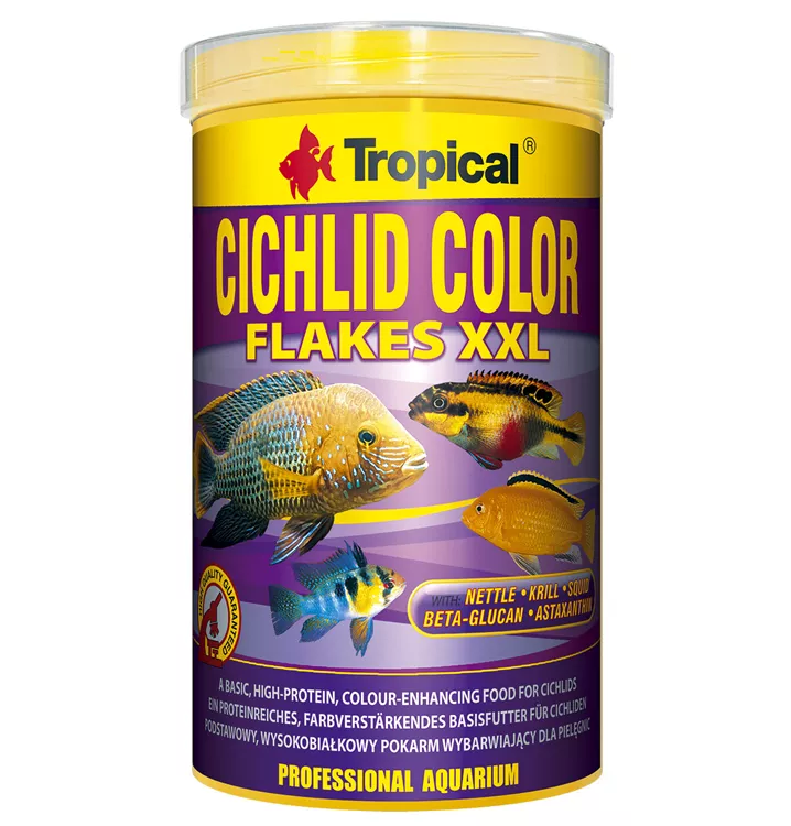 CICHLID COLOR ist ein proteinreiches, farbverstärkendes Flockenfutter für die tägliche Fütterung alles- und fleischfressender Cichliden, einschließlich vieler Arten von Malawisee-Cichliden. Vitamin C und Beta Glucan, ein natürliches Immunstimulans, stärken das Immunsystem. Zeolith trägt zu einem gesunden Verdauungssystem bei und fördert die Ausscheidung von Giften aus dem Fischkörper. Der Zusatz von Nesseln fördert auch den Metabolismus. Krill, Spirulinasind eine Quelle natürlicher Carotinoide, die eine herrliche Farbenpracht garantieren.