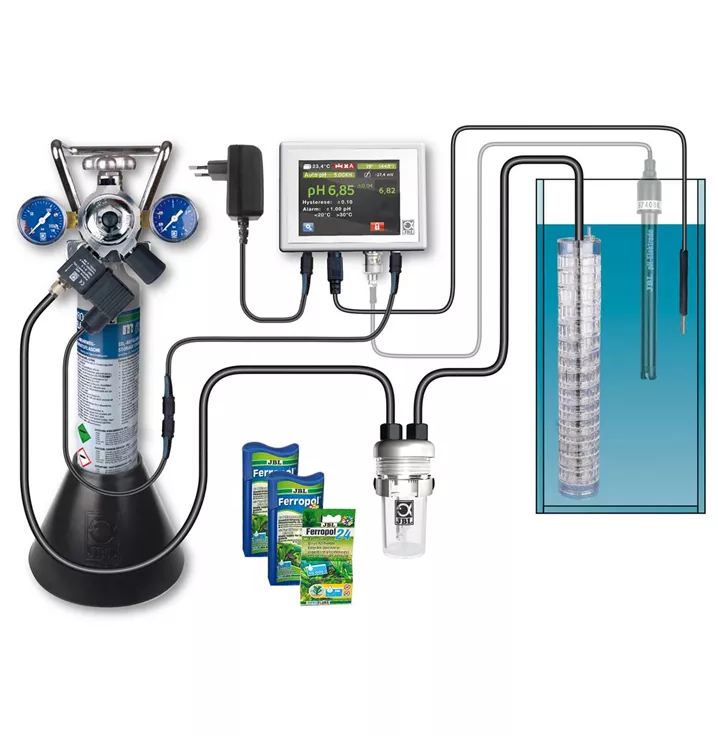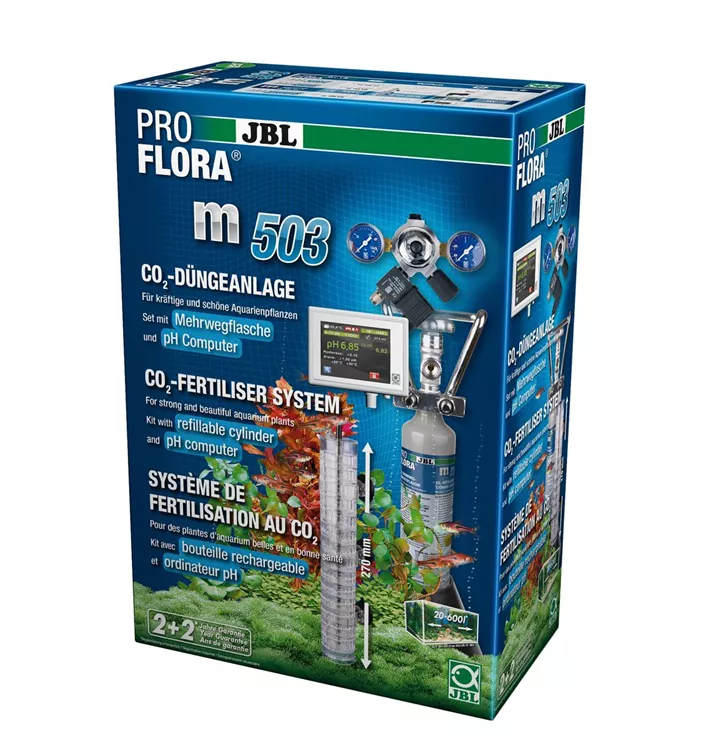 CO2 - Düngeanlage mit automatischer pH-Steuerung für die optimale Versorgung von schnell und langsam wachsenden Pflanzen in Süßwasser-Aquarien von 100 - 600 l Komfortabel und effizient: Wiederbefüllbare 500 g Mehrwegflasche, Einfache Montage, keine separate Wasserpumpe nötig, auf Einwegsystem umrüstbar Professionelle Wasserpflege, automatische Steuerung: Präzise Dosierung dank Druckminderer, gleichmäßige Ausströmung, effektive Verteilung durch erweiterbaren Diffusor, Kontrolle: Blasenzähler mit Rücklaufsicherung. Restdruckanzeige am Manometer Vorratsflasche TÜV-geprüft, Druckflasche mit Überdrucksicherung. Kein Umfallen der Flasche durch Standfuß. Kein Abrutschen des Schlauches durch Schlauchverschraubungen, Rückschlagventil verhindert Wassereindringen in Flasche Lieferumfang: ProFlora m503, Armatur, Standfuß, Druckminderer, pH Steuergerät (pH-Sensor nicht enthalten), Reaktor, Blasenzähler, Schlauch, Rücklaufsicherung, inkl. 500g Mehrweg-CO2-Flasche.