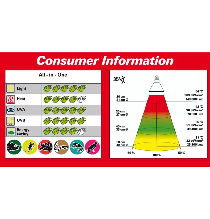 Die Bright Sun UV Jungle wurde speziell für tropische Arten entwickelt. Sie hat eine etwas geringere UV-Leistung als die Bright Sun UV Desert, um den Bedingungen im natürlichen Habitat und der Lebensweise der Tiere Tribut zu zollen. Die Blätter und Zweige im Regenwald filtern einiges an UV-Licht, so dass die Tiere nicht die volle Intensität der Sonne zu spüren bekommen. Zusätzlich muss man beachten, dass baumbewohnende Tiere im Terrarium oft die Möglichkeit haben, sehr nahe an die Lampen heranzukommen. Da UV-Strahlung generell ein Gefahrpotential hat und die UV-Intensität bei 10 cm Abstand 5mal so hoch wie bei 30 cm Abstand ist, wurde bewusst der UV-Anteil reduziert. Das Spektrum wurde an die natürlichen Bedingungen in Waldregionen angepasst. Die Farbtemperatur beträgt 4000K und ist damit deutlich wärmer als das Tageslicht der Bright Sun UV Desert. Tests haben gezeigt, dass tropische Echsen wie Wasseragamen unabhängig vom UV-Anteil das wärmere Licht der Bright Sun UV Jungle dem Tageslicht der Bright Sun UV Desert vorziehen. Außerdem werden die grünen Farben von Pflanzen durch das wärmere Licht besser hervorgebracht, so dass im Terrarium ein richtiges Waldambiente entsteht.
