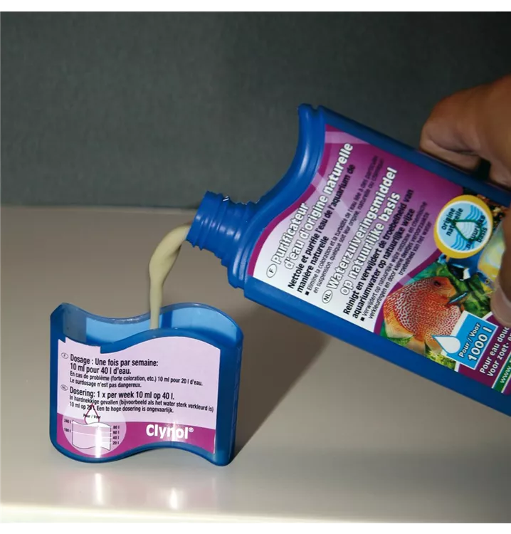 Wasserreiniger auf natürlicher Basis. Reinigt und klärt Aquarienwasser auf natürliche Weise. Für Süß- und Meerwasser, Wasserschildkröten und Garnelenaquarien Reinigung und Klärung, Beseitigung von Verfärbungen und Trübungen, Bindet Schwermetalle, Ammonium, Proteine und unangenehme Gerüche durch Mineralien Gesundes Wasser, gesunde Fische: Förderung des Wohlbefindens der Aquarienbewohner Anfängliche Trübung verschwindet nach 2-24 Stunden wieder und das Wasser wird kristallklar Lieferumfang: 1 Flasche Clynol. Anwendung: Wöchentlich 10ml/40 l Wasser. Beispiel 60 l Aquarium: 15 ml. Bei starken Problemen: 10 ml/40 l.