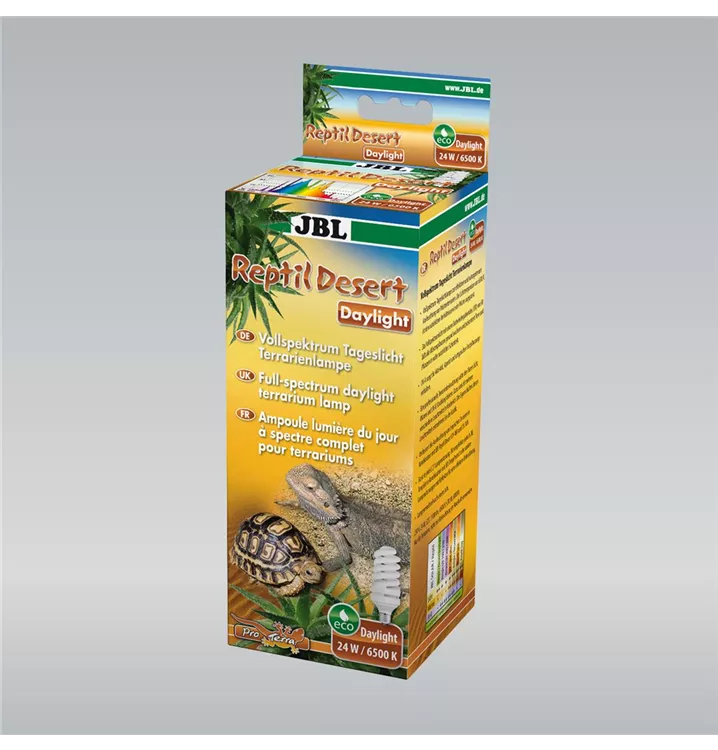 Vollspektrum- Energiesparlampe ohne UV-Anteil für Wüstenterrarien. Tageslichtlampe für Tiere, die kein UV-Licht vertragen. 6500 K Farbtemperatur. E27 Fassung. Lieferumfang: Energiesparlampe für Wüstenterrarien, ReptilDesert Daylight.