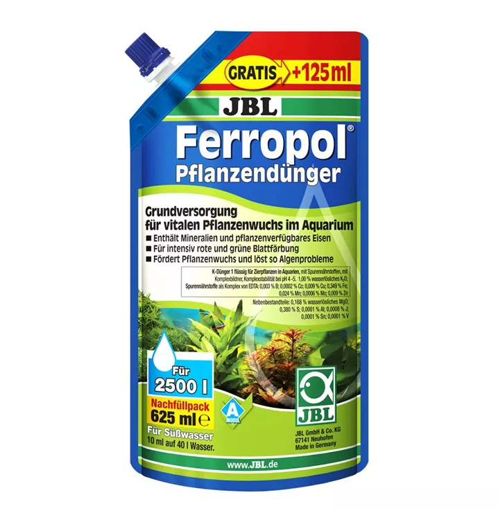 Grundversorgung für Wasserpflanzen: Basisdünger für Süßwasser-Aquarien Vitales Pflanzenwachstum, keine Mangelerscheinungen: Wichtige Mineralien durch Eisen, Kalium weitere Spurenelemente Intensive Blattfärbung durch optimale Eisenkonzentration und Zusammensetzung Optimale Wuchsförderung der Pflanzen bedeutet weniger Algenprobleme. Ohne Phosphate und Nitrate. Unschädlich für Süßwasserkrebse und Garnelen Lieferumfang: 1 Nachfüllbeutel Ferropol, 625 ml. Anwendung: 10 ml/40 l Wasser. Nachdüngung 7,5 ml.