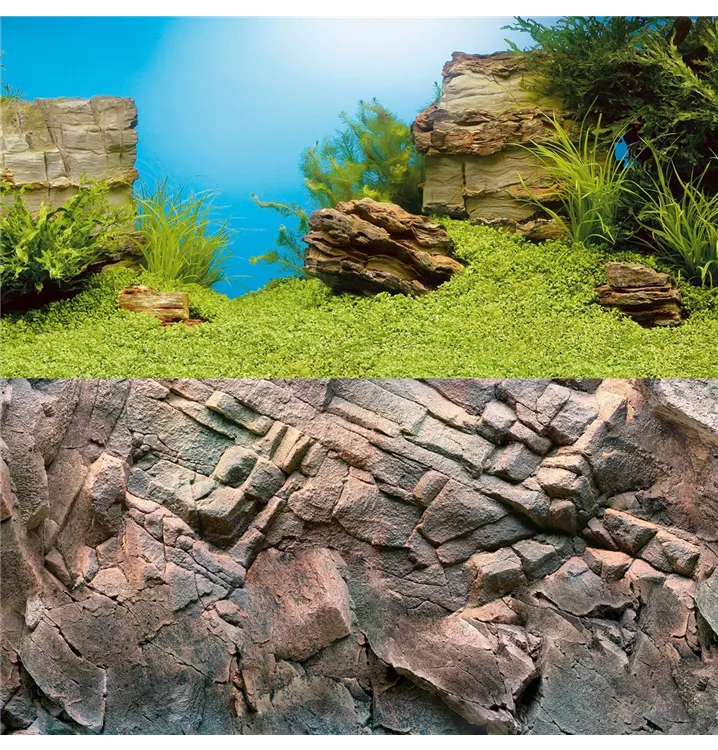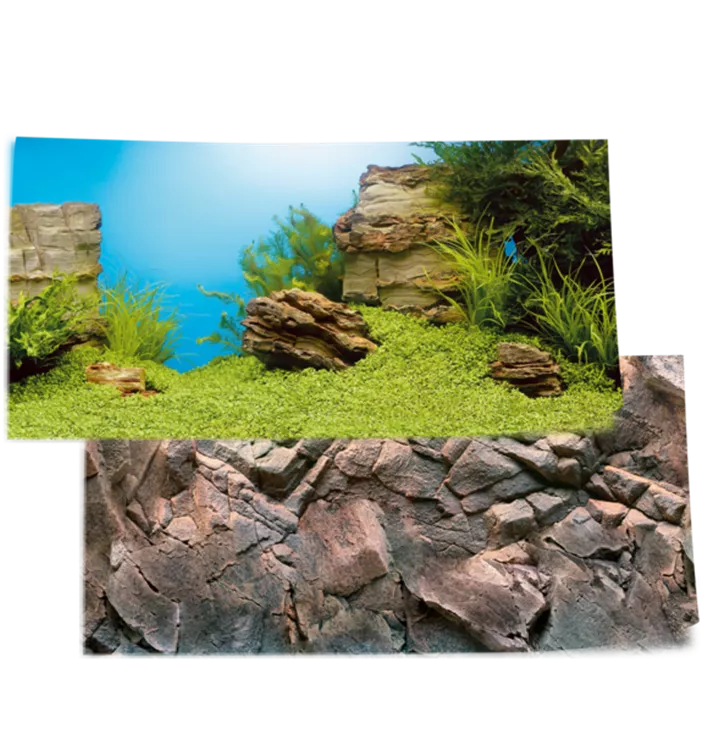 Das Poster 1 bietet mit seiner Unterwasserlandschaft auf der Vorderseite und seinem Felsmotiv auf der Rückseite zwei ansprechende Motive für die variable Gestaltung Ihres Aquariums.