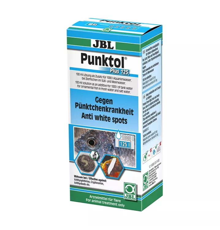 Gegen weiße Pünktchen und andere Ektoparasiten Bei Parasitenbefall für Süß- und Meerwasserfische und eingeschränkt für wirbellose Aquarienbewohner Gegen Wiederbefall: Wegen Lebenszyklus des Erregers muss mehrfach dosiert werden. Erreger lösen sich nach einigen Tagen vom Fisch, sinken zu Boden. Ohne Kupfer JBL-Onlinehospital: Zugang zum Erkennen von Fischkrankheiten Lieferumfang: 1 Packung Punktol Plus 125, 100 ml. Geeignet für max. 1000 l Aquarienwasser. Bei mehrmaliger Anwendung für max. 125 l Wasser. Anwendung: 10 ml/100 l. Behandlungsdauer: ca. 15 Tage alle 2 Tage = 8 Dosierungen.