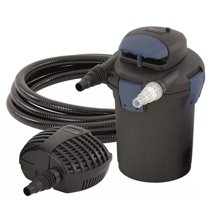 Das Teichfilter-Set Oase BioPress Set 4000 bestehend aus Druckfilter, integrierter UVC-Einheit, Filterpumpe, Schlauch und Anschlüssen