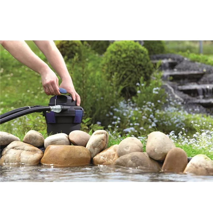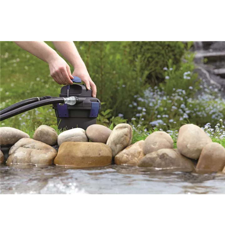 Im Lieferumfang enthalten: 4,5 m ¾" (19 mm)-Schlauch und OASE Filterpumpe 1500: 25 W; 1500 l/h Qmax; 1,9 m Hmax