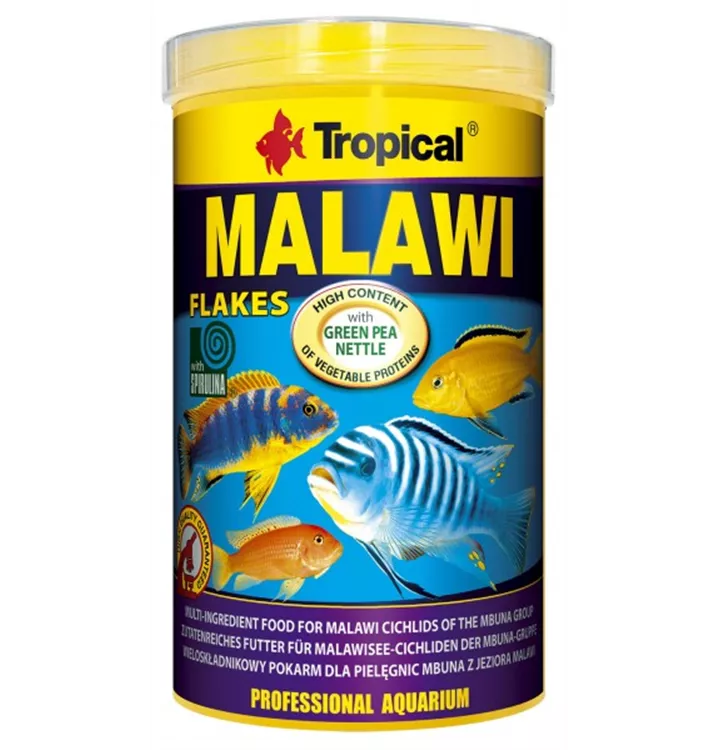 MALAWI ist ein zutatenreiches Flockenfutter für Malawisee-Cichliden der Mbuna-Gruppe und andere alles- undpflanzenfressende Cichliden. Seine auf Vielfalt basierende Rezeptur garantiert den Fischen eine ausgezeichnete Gesundheit sowie eine herrliche Farbenpracht und regt die Fortpflanzung an. Fasern und Nesseln regulieren die Tätigkeit des Verdauungstraktes der Cichliden. Grüne Erbsen und Spirulina sind eine Quelle von leicht assimilierbarem Protein. Weizenkeime liefern wertvolle ungesättigte Fettsäuren. L-Carnitin regt den Fettmetabolismus an. Zeolith trägt zu einem gesunden Verdauungssystem bei und fördert die Ausscheidung von Giften aus dem Fischkörper. MALAWI ist für die Fische äußerst schmackhaft und wird daher sogar von importierten Fischen gerne gefressen.