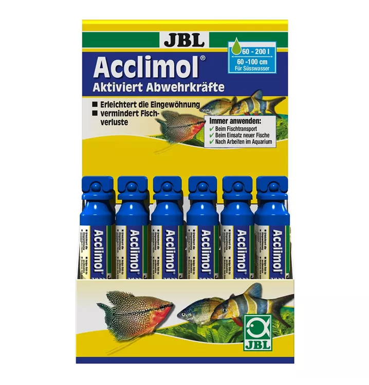 Für fischgerechtes Aquarienwasser: Beim Einsetzen neuer Fische, nach Arbeiten im Aquarium, beim Fischtransport zur Aktivierung der Abwehrkräfte für Süßwasser-Aquarienfische Stressschutz und Unterstützung des Immunsystems durch Mulitvitaminkomplexe mit Vitamin C Gesundes Wasser, gesunde Fische: Schutz von Schleimhaut, Kiemen, Haut und Flossen durch Schutzkolloide Vorbeugung von Jod-Mangelerscheinungen durch Jod-Komplex Lieferumfang: 1 Flasche Acclimol. Anwendung: 10 ml/40 l Wasser. Beispiel 60 l Aquarium: 15 ml bei Neueinrichtung, 5 ml bei 1/3 Wasserwechsel alle 2-3 Wochen.