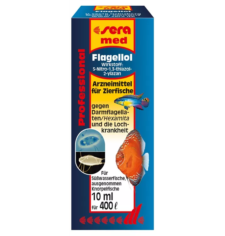 Wasseraufbereiter zur effektiven und schonenden Beseitigung von Darmflagellaten (u. a. Hexamita sp., Spironucleus sp. – Verursacher der Lochkrankheit) sowie anderer einzelliger Darmparasiten. Weiterhin ist sera med Professional Flagellol wirksam gegen den Erreger der Samtkrankheit (Piscinoodinium pillulare).