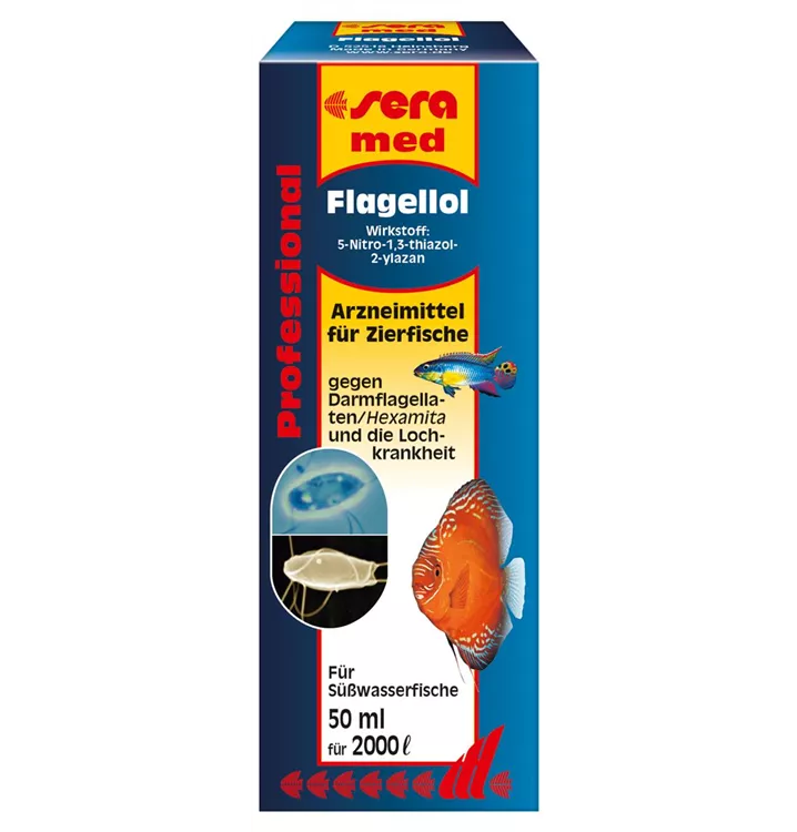 Wasseraufbereiter zur effektiven und schonenden Beseitigung von Darmflagellaten (u. a. Hexamita sp., Spironucleus sp. – Verursacher der Lochkrankheit) sowie anderer einzelliger Darmparasiten. Weiterhin ist sera med Professional Flagellol wirksam gegen den Erreger der Samtkrankheit (Piscinoodinium pillulare).