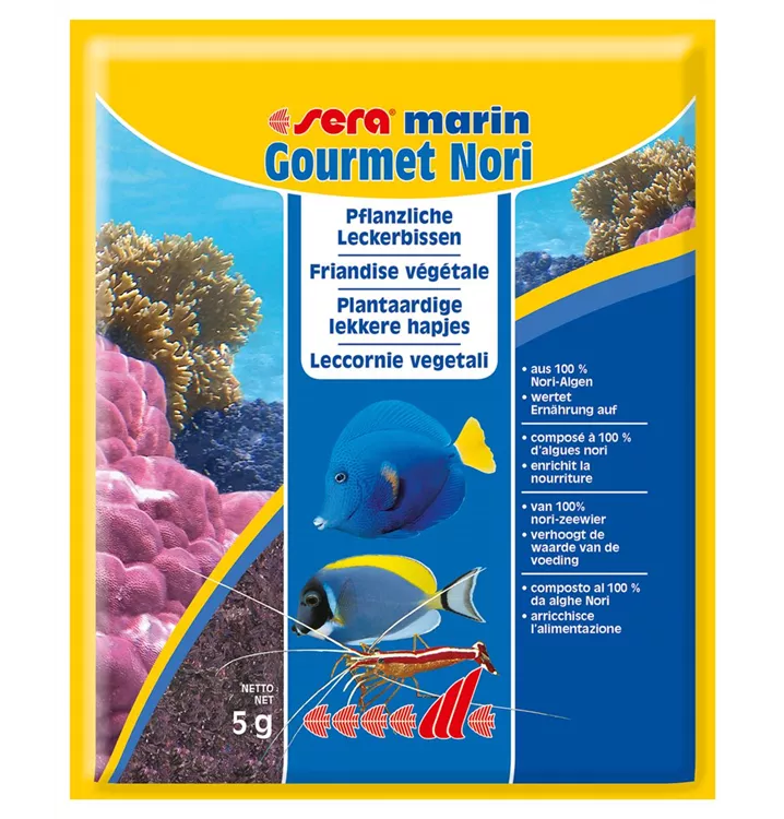 sera marin Gourmet Nori ist der Leckerbissen aus 100 % schonend getrockneten Nori-Algen für Aquarientiere wie Algen fressende Fische, Krebstiere und Seeigel.