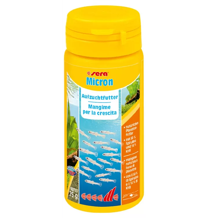 sera Micron ist das naturnahe Aufzuchtfutter, das schon die kleinsten und anspruchsvollsten Aquarientiere (Fisch-, Amphibienlarven, Artemia-Shrimps u. a.) im Süß- und Meerwasser gerne fressen.