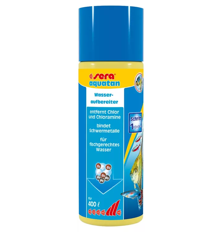 sera aquatan beseitigt sofort die Schadstoffe und bereitet das Wasser zu fischgerechtem, gesundem Aquarienwasser auf. Optimale Lebensbedingungen für Fische, Wirbellose, Pflanzen sowie nützliche Mikroorganismen sind garantiert.