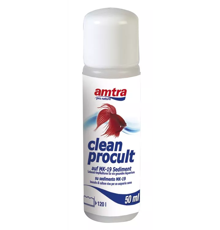 Lebend-Impfkulturen für ein gesundes Aquarium. Verwandelt für die Dauer von wenigen Stunden das gesamte Aquarium in einen großen, hochaktiven biologischen Filter. Bewirkt eine biologische Grundreinigung. Organische und anorganische Schadstoffe werden sicher gebunden mit einem positiven Effekt auf die gesamte Biologie des Aquariums. Clean procult besteht aus zwei Komponenten: Erstens aus Milliarden hochspezialisierter, schadstoffabbauender Bakterien und zweitens aus einem speziell entwickelten Mineralgranulat (MK-19 Sediment), auf dem diese Bakterien siedeln. Führt zu weniger Algen - kristallklarem Wasser - gesünderen Fischen