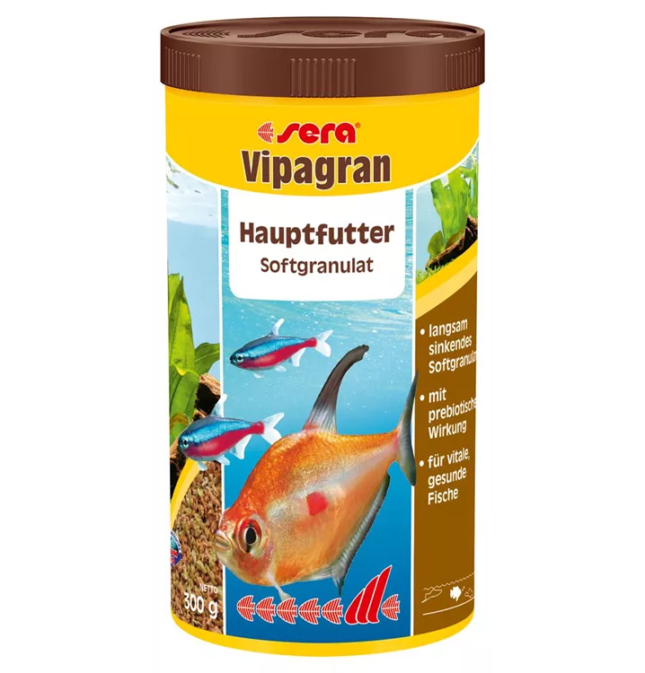 sera Vipagran ist das beliebte Hauptfutter aus schonend hergestelltem Softgranulat für alle in der mittleren Wasserzone fressenden Fische.