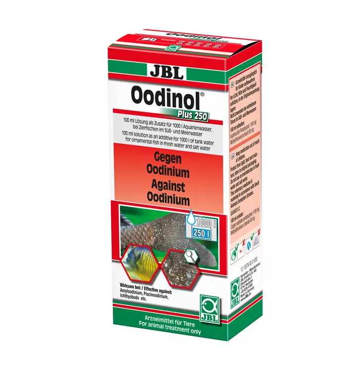 Gegen alle Arten von Oodinium-Erregern Bei Parasitenbefall für Süß- und Meerwasserfische. Nicht für wirbellose Aquarienbewohner geeignet Gegen Wiederbefall: Wegen Lebenszyklus des Erregers muss mehrfach dosiert werden. Erreger lösen sich nach einigen Tagen vom Fisch, sinken zu Boden. Genaue Dosierung mit Kupfer Test-Set kontrollieren und einstellen JBL-Onlinehospital: Zugang zum Erkennen von Fischkrankheiten Lieferumfang: 1 Packung Oodinol Plus 250. Geeignet für max. 1000 l. Bei mehrmaliger Anwendung für max. 250 l. Anwendung: 1. Tag 10 ml/100 l . 2. Tag < 0,05 mg/l: 10 ml/100 l ; 0,1 - 0,15 mg/l Kupfer: 5 ml/100 l nachdosieren.3. + 5. Tag wie 2. Tag.