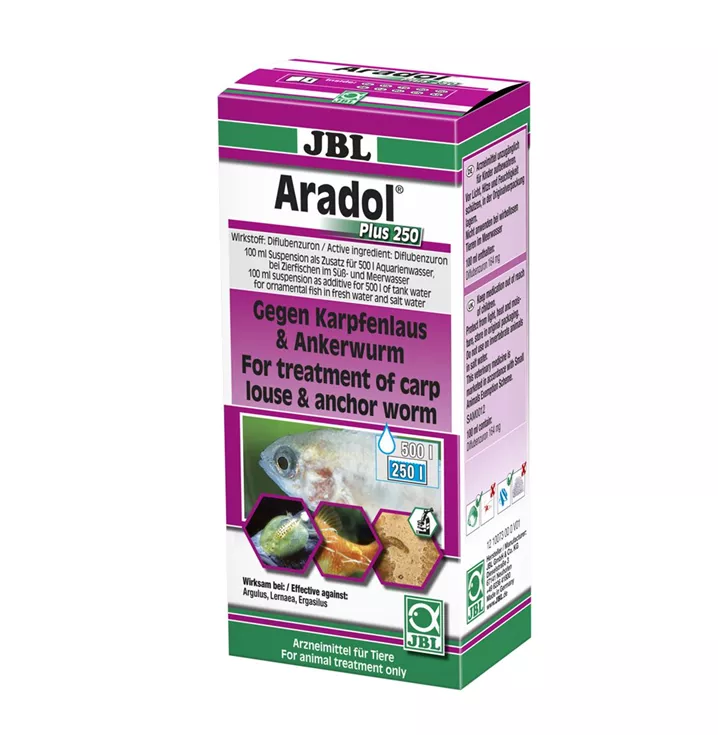 Gegen Karpfenläuse, Ankerwürmer, Kiemenkrebse und Asseln. Unter 18 °C wirkungslos Bei Parasitenbefall für Süß- und Meerwasserfische. Nicht für wirbellose Aquarienbewohner geeignet! Das Heilmittel tötet nicht den Parasiten, sondern verhindert sein Wachstum. Erreger stirbt dann ab JBL-Onlinehospital: Zugang zum Erkennen von Fischkrankheiten Lieferumfang: 1 Packung Aradol Plus 250, 100 ml. Geeignet für Aquarien max. 500 l. Bei mehrmaliger Anwendung für max. 250 l. Anwendung: 1. Tag: 10 ml/50 l Wasser. 8. Tag: 50 % Wasser wechseln. 14. Tag: 10 ml/50 l Wasser.