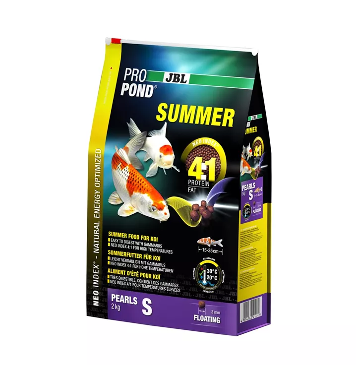Alleinfutter mit richtigem Protein-Fettverhältnis von 4:1 nach NEO Index, der Wassertemperatur, Funktion, Tiergröße und Alter berücksichtigt Mit Mais, Lachs, Soja, Garnelen, Gammarus und Spirulina für kräftige und gesunde Koi (bei 20-30 °C Wassertemperatur) Futtergröße S (3 mm) für Fische von 15-35 cm. Schwimmende Futterperlen mit 28 % Protein, 7 % Fett, 3 % Rohfaser und 8 % Rohasche Futterperlen in wiederverschließbarem, luft- und wasserfestem sowie lichtdichtem Beutel für Qualitätserhalt.
