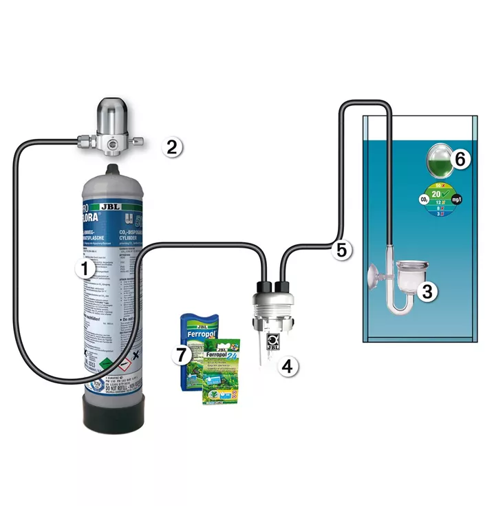 CO2 - Düngeanlage für die optimale Versorgung von schnell und langsam wachsenden Pflanzen in Süßwasser-Aquarien von 20 bis 400 l Professionelle Pflanzenpflege: Präzise Dosierung durch Druckminderer. Gleichmäßige Ausströmung, effektive Verteilung durch Keramik-Diffusor. Kontrolle: Blasenzähler mit Rücklaufsicherung und CO2-/pH-Test Durch Aufschrauben des Adapters (JBL Adapt u-m, nicht enthalten) kann auf Mehrwegflaschen umgerüstet werden Einweg-Vorratsflasche TÜV-geprüft. Kein Abrutschen des Schlauches durch Schlauchverschraubungen, Rückschlagventil verhindert Wassereindringen in Flasche Lieferumfang: 500 g Einweg CO2-Flasche, Druckminderer, 3 m Schlauch, Blasenzähler mit Rückschlagventil, Keramikdiffusor, Dauertest mit Reagenzien, 1x Pflanzendünger 100 ml, 1x Tagesdünger 10 ml.