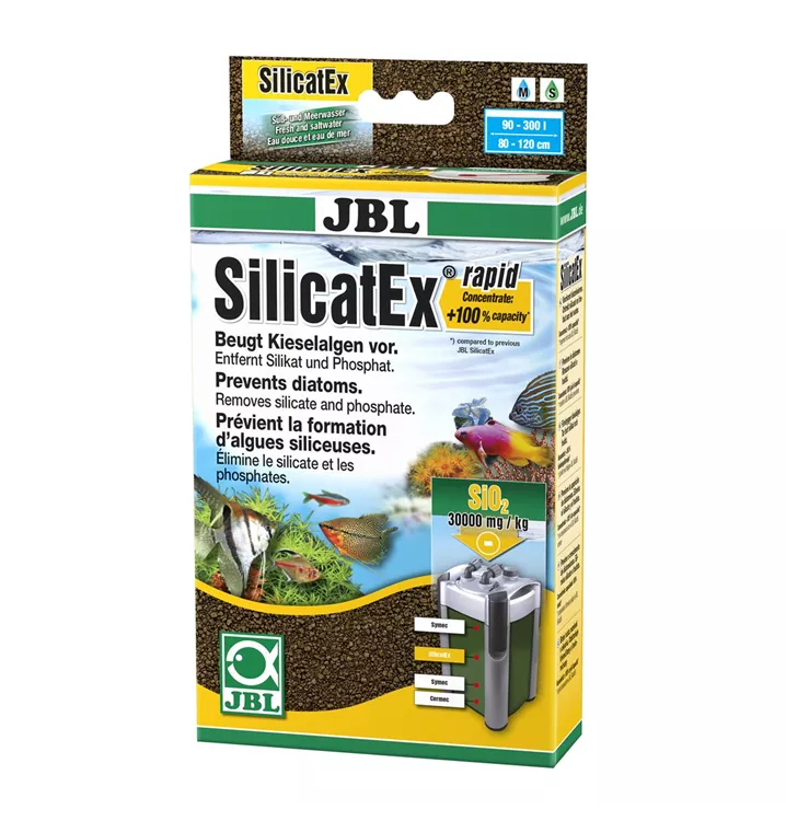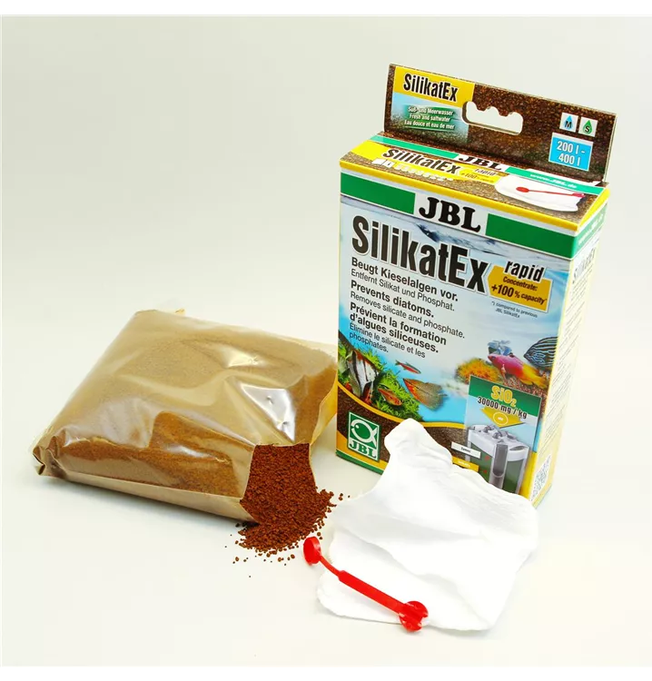Filtermaterial zur Entfernung von Kieselsäure (Silikate) im Süß- und Meerwasser, die zur Kieselalgenbildung führen Ausspülen, in Filterbeutel (beiligend) füllen und im Filter platzieren. Nach ein bis zwei Wochen ausspülen Kieselalgen können unschöne braune Beläge auf Kies, Dekomaterial und Pflanzen bilden Silikatgehalt mit JBL Silikat-Test überprüfbar. Wirkung: Werte unter 0,4 mg/l Silikat verhindern Kieselalgen Garantierte Effektivität: Bindet bis zu 30.000 mg Silikat (SiO2)/ kg. Inklusive Netzbeutel und Verschlussclip.