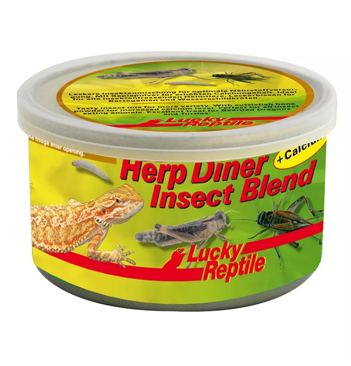 Lucky Reptile Herp Diner Insect Blend enthält große Grillen, mittlere Heuschrecken und Bambusmaden, um den Tieren ein abwechslungsreiches und nahrhaftes Futter zu bieten. Die Zugabe von Sepiapulver sorgt für einen erhöhten Calciumgehalt und ein optimales Calcium-Phosphor Verhältnis verglichen mit lebenden Insekten. Durch den speziellen Konservierungsprozess, der die Nährstoffe erhält, ist die Akzeptanz sehr hoch. Herp Diner Insect Blend ist für alle insektenfressenden Reptilien und Vögel geeignet. Vor allem eignet es sich hervorragend für Bartagamen und auch größere Wasserschildkröten.