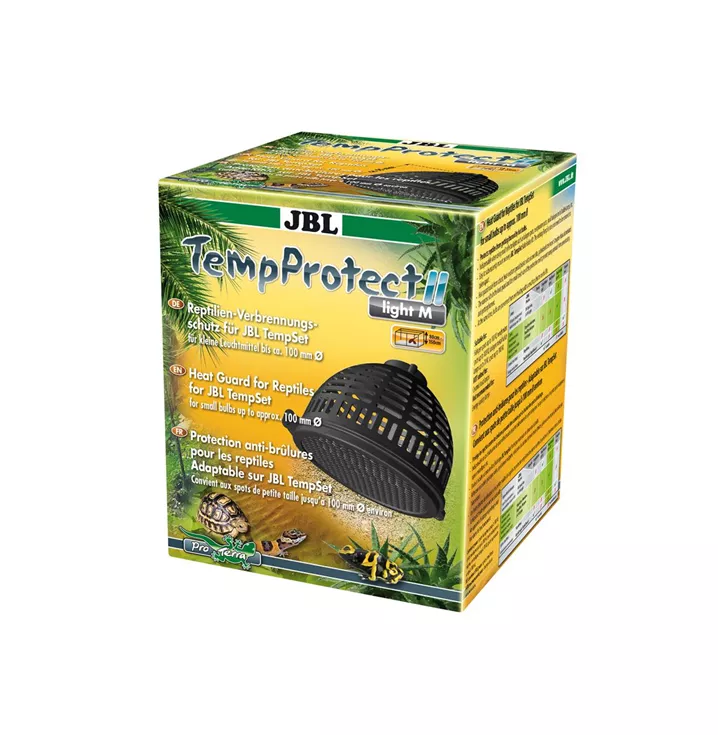 Sicherheit für Reptilien in Terrarien: Lampenschirm aus bis 290 °C hitzebeständigem, formstabilem Spezialkunststoff LCP (Liquid Crystal Polymer) Montage: Adapter rausdrehen, um die Fassung vom JBL TempSet legen, Adapter mit TempSet wieder reindrehen Verhinderung der Überhitzung und Verkürzung der Leuchtmittel-Lebendsdauer. Geeignet für: UV-Spots, Halogen-Metalldampfstrahler und andere Optimale Sicherheit: Schmale Schlitze, enge Maschenweite verhindert Eindringen und Verbennungen an Jungtieren Enthält: Schutzkorb komplett mit Metallgitterabdeckung und Bajonett für JBL TempSet (nicht enthalten), Schraubendreher.