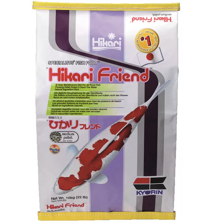 Vorteilhaftes komplettes Basisfutter Hikari Friend™ ist ein komplettes tägliches Futter für alle Koi und Teichfische, zu einem erschwinglichen Preis. Enthält alle Grundnährstoffe. Ausgewogene Zusammensetzung von nahrhaften Zutaten. Enthält stabilisiertes Vitamin C, das ein gesundes Immunsystem unterstützt. Schwimmende Pellets, die schnell aufweichen und das Teichwasser nicht verschmutzen.