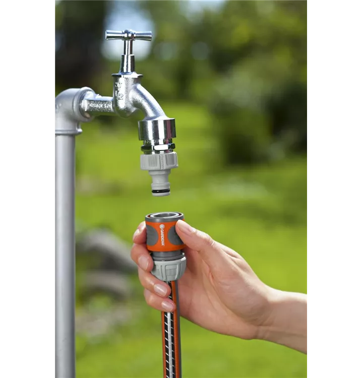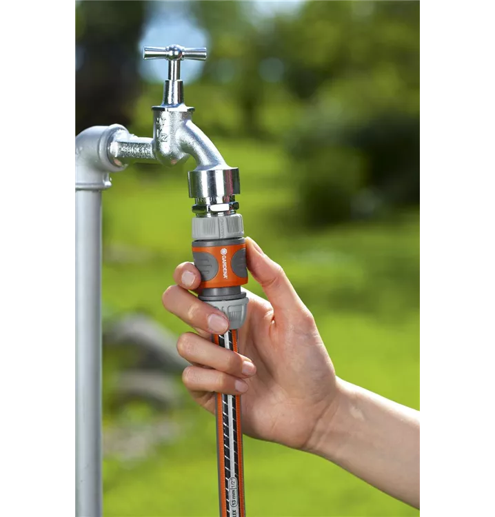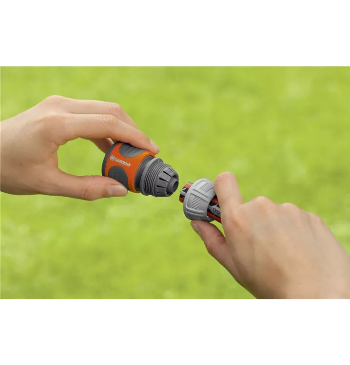 GARDENA Schlauchverbinder. Schneller Anschluss für den Schlauchanfang. Komfortablere Handhabung. Neue bedienungsfreundliche Form der Klemmmutter. Bessere Verbindung zum Schlauch. Einfaches Ziehen löst die Verbindung.