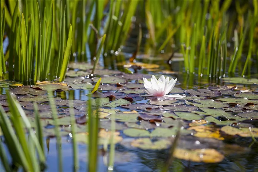 Nymphaea, weiß Stehen nur eine Terrasse oder ein Balkon zur Verfügung, ist ein Miniteich die richtige Wahl. Es gibt ihn in verschiedensten Varianten. Im kleinen Stil lässt sich Wasser besonders schön auf Steinbrunnen, Wassergärten oder Sprudelsteinen inszenieren. Auch ein Vogelbad bringt Frische auf den Balkon – und ein grüner Daumen ist nicht gefragt! Darf es etwas aufwändiger sein, kann ein Miniteich im Fass oder Eimer angelegt werden. Auf kleinstem Raum können hier mit etwas Geschick eigenständige Biotope entstehen und wenn die Dimensionen des Teichs passen, können sogar Fische gehalten werden. Besonders praktisch: Miniteiche gibt es auch als Fertigteiche zu kaufen!